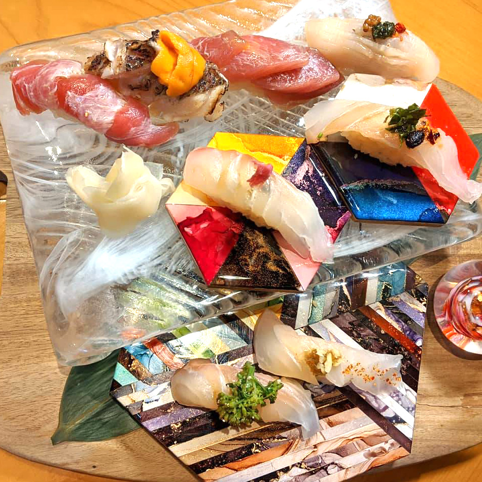 - 世界中で飽和状態にある既存の寿司をさらに現代の盛り合わせ技法等を駆使して継続的進化をめざします。